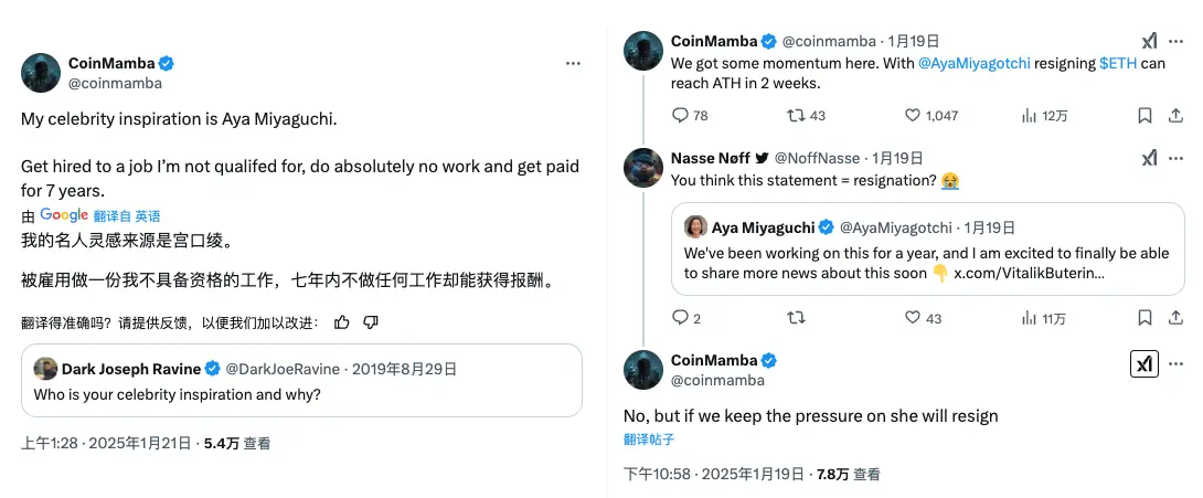 他们甚至试图通过舆论压力让 Aya 离开:发表过「Aya 离开的那天就是以太坊的解放日」、「Aya 离开的两周内 ETH 就会新高」、「我们继续施压,她就会辞职」等言论。甚至有一些人对她发出不理性的辱骂和死亡威胁。