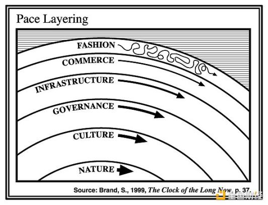 我想借用 Stewart Brand 的《Pace Layering》来解释我对以太坊的看法。他提出了一个世界运作的框架,该框架受到了 Brian Eno 的《Shearing Layers》的启发。随着时间的推移,这个模型塑造了一群有影响力的人士、技术专家、艺术家、未来学家和组织的思维。