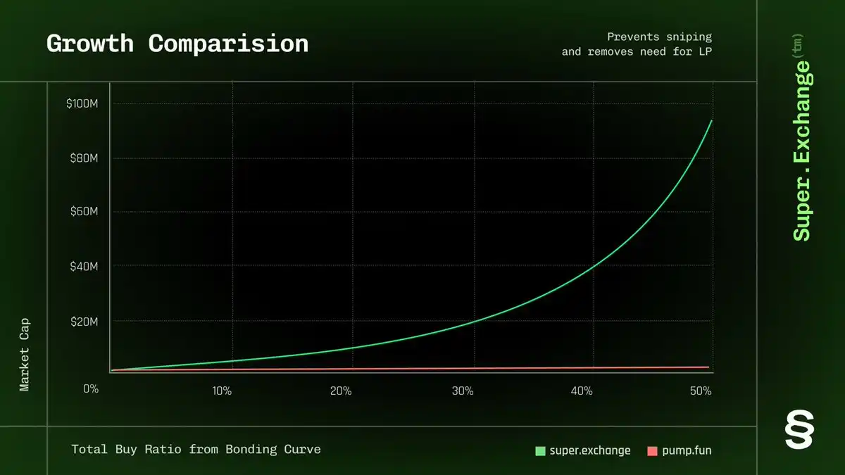 使用 Super Curve 与传统 Bonding Curve 代币增长的对比,图片来自 @_superexchange 官方账号