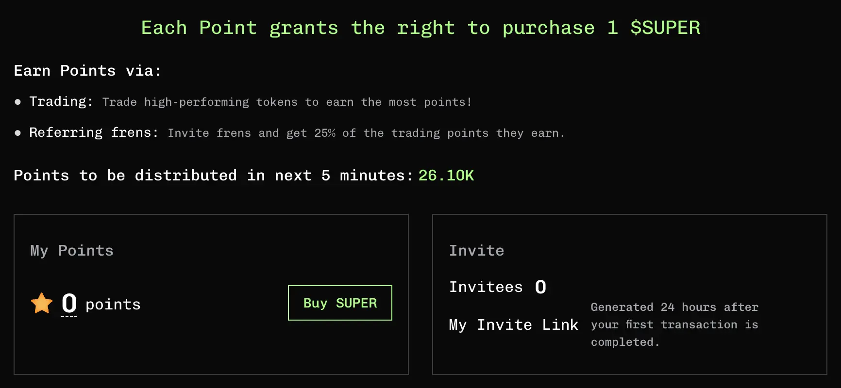 目前官网只给出两种获得$SUPER 的方式:交易和拉新。交易表现越高的代币,赚取的积分越多;邀请好友则是可以获得他们交易积分的 25% 。1 积分 = 购买 1 SUPER 的权利,相当于只有平台活跃的交易者才有购买$SUPER 的权利,有利于让真正使用平台进行交易的早期用户享受红利,而不是让鲸鱼们在新的 DeFi 协议中锁定数百万的流动性。