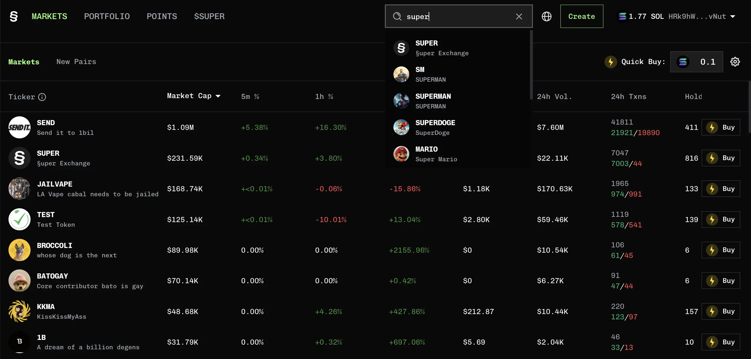 Super.exchange 也有内外盘之分。主页点击「MARKETS」后即可看到代币看板,其中「Markets」是外盘;「New Pairs」相当于内盘。各个代币的市值 Super Curve 来进行计算。点击代币头像进入购买页面可自行设置金额和滑点。购买后可在「PORTFOLIO」查看购买的资产。