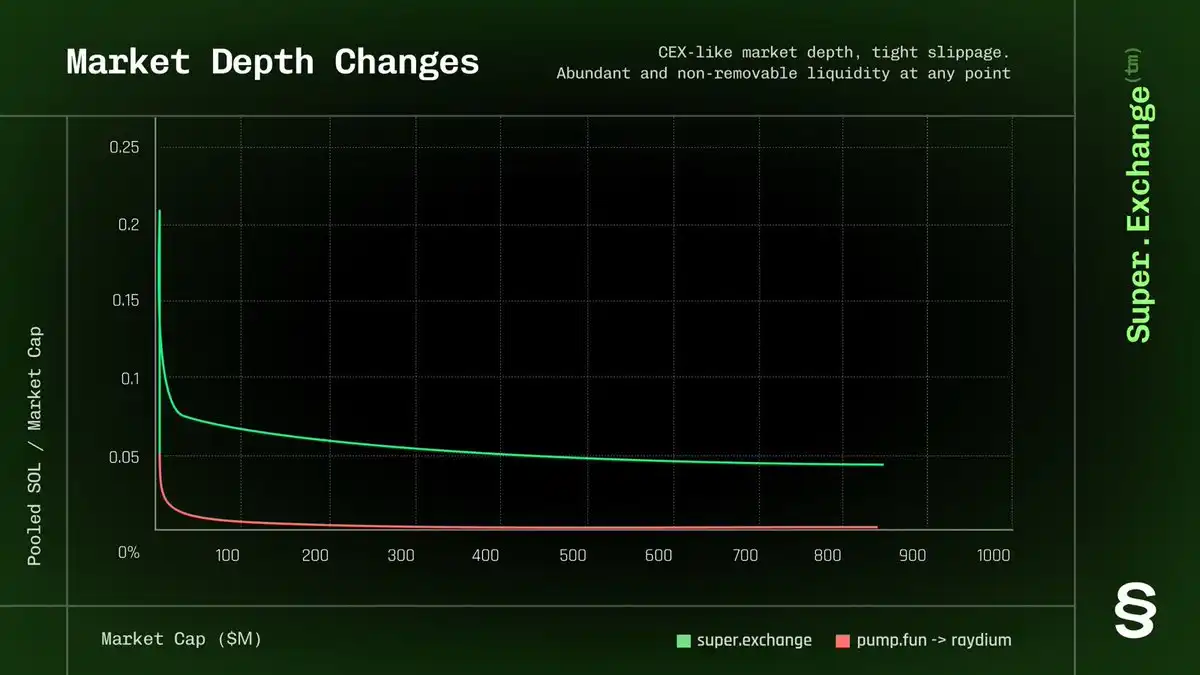 在 Pump.fun 上,随着市值的增加,池子的深度迅速下降。Super.exchange 通过消除对流动性提供者的依赖,防止撤池子,确保可持续的流动性,创造了一个安全且有增长潜力的交易环境。