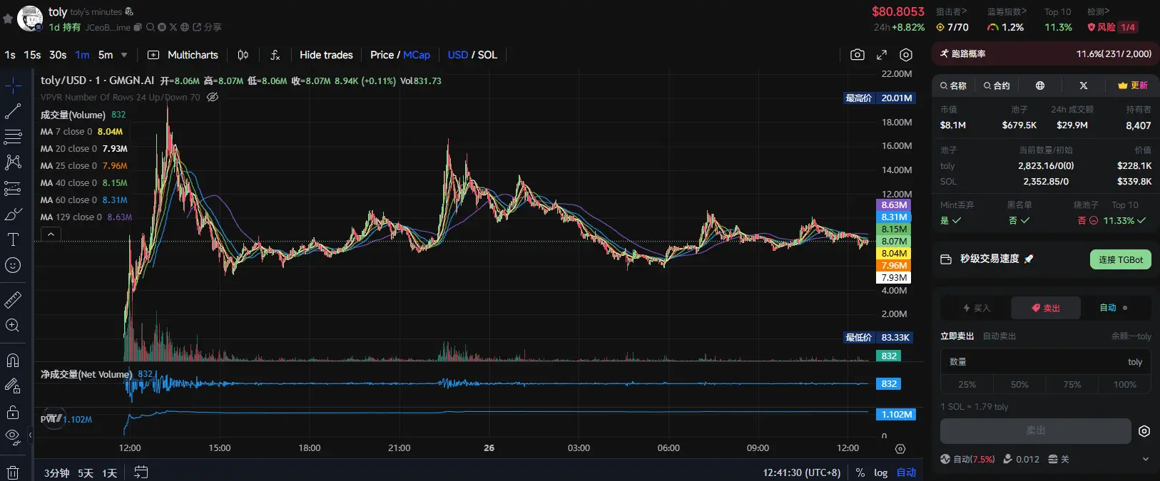 其代币 $toly(toly's minutes)上线后最高市值达到 2000 万美金,现市值 800 万美金附近,单价 80 美元/枚, 或者说 80 美元/分钟 。