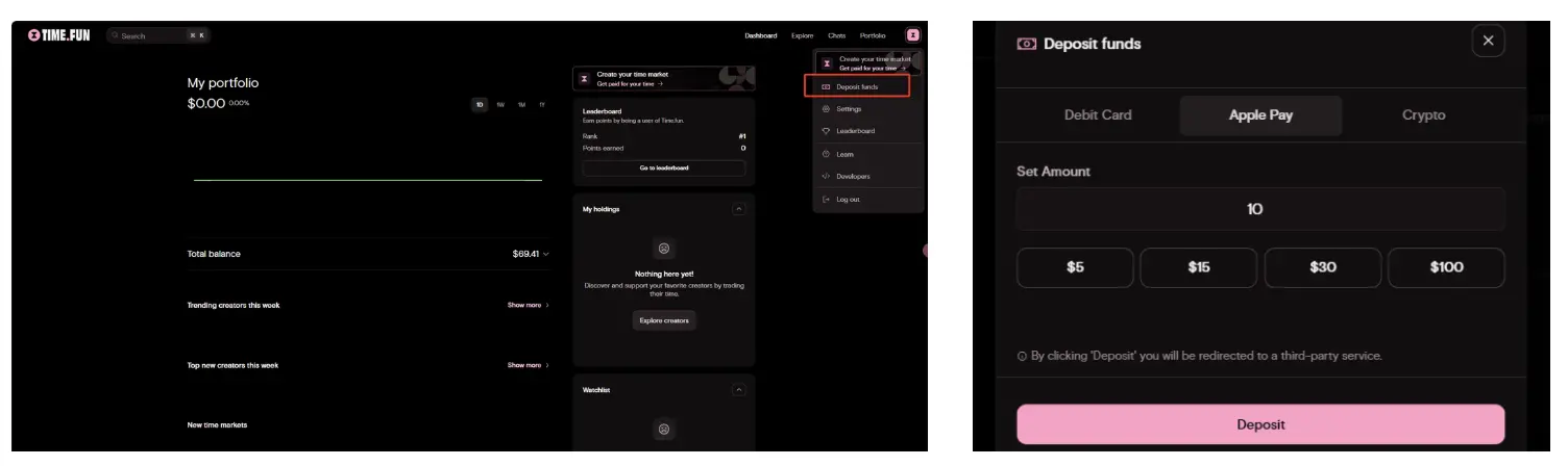 平台内交易通过 USDC 计价,不用连接已有钱包,平台会生成专属的对应钱包账户,需要往账户中存入 Solana 网络的 USDC,可以通过信用卡、Apple Pay 和加密转账的方式。