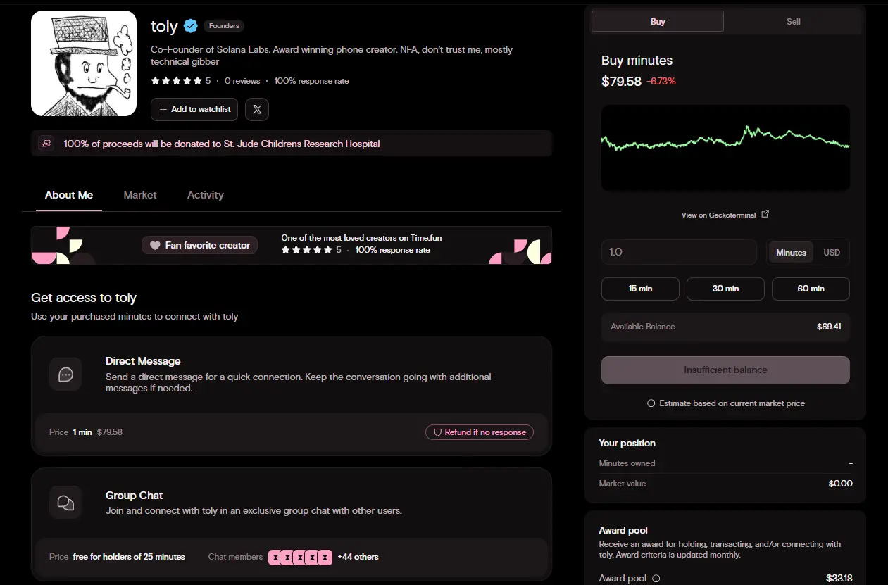 昨天,Solana 联创 Toly( @aeyakovenko )“发币”了,但不同于之前在 pump.fun 发射的名人币,这次 Toly 选择的平台叫 Time.fun ,一个可以出售自己时间的 SocialFi 平台。