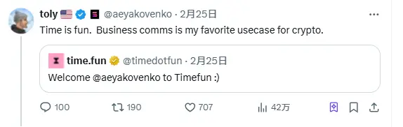 Time.fun 前身为 Circle.tech,最初部署于 Base 生态,于近日正式在 Solana 生态发射。Toly 不仅选择第一时间入驻 Time.fun,并且对于项目本身也不吝赞美:“商务通讯是我最喜欢的加密用例”。