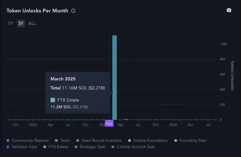 2025 年 3 月 1 日,最大的 SOL 代币解锁将发生。约 22 亿美元的代币将被释放,这将导致价格大幅下跌,许多持有长仓的投资者会卖出以锁定利润,从而引发大规模的挤压。