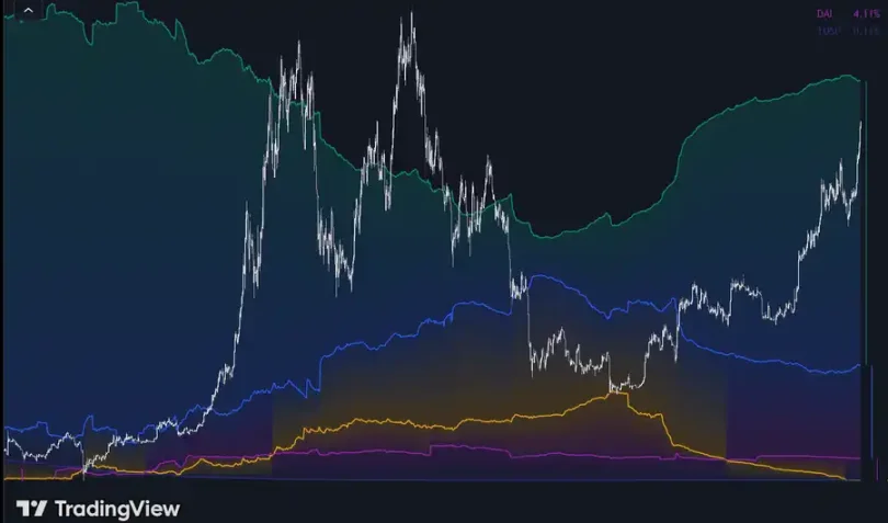 另一方面,稳定币指数仍远低于以往周期的水平,这个指数显示了有多少新资金进入加密市场。目前,它才刚刚开始上涨。