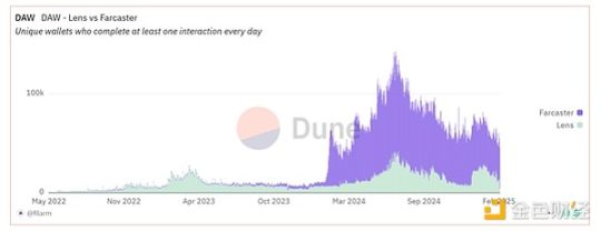 目前,Farcaster 通过约 100 万个 Farcaster ID (FID) 看到的每日活跃钱包 (DAW) 数量大约是 Lens 的 4 倍,而 Lens 的账户数量约为 64 万个。