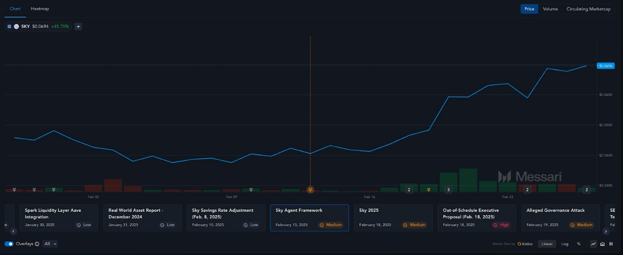 - 作为核心驱动因素的治理:相当一部分事件与治理提案和执行决策有关,特别是围绕 Maker 及其相关协议(包括 Sky Protocol)。市场对这些提案审慎而又一致的反应,突显出投资者对长期风险管理和战略资本流动的关注。治理动态被视为未来稳定和增长的指标。