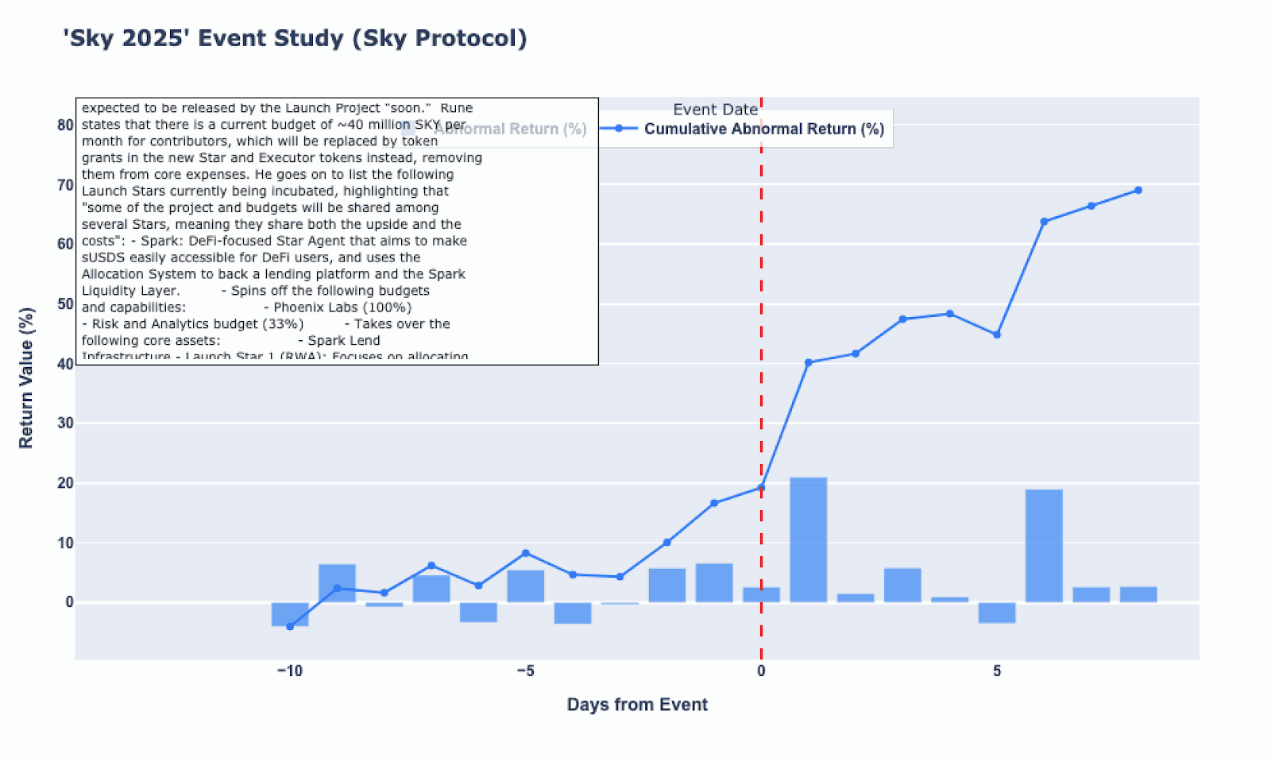 Maker 和 Sky Protocol:Maker 因其定期发布的重点治理事件(包括执行提案和参数调整)而脱颖而出。Sky Protocol 经常与 Maker 一起被提及,显示出一致的异常反应,突显出投资者重视治理叙事和资本流动系统。