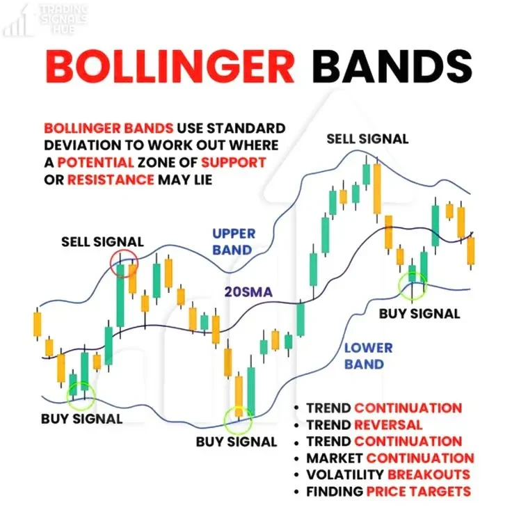 – 当布林带变窄(“挤压”)时,通常意味着市场即将迎来剧烈波动。如果价格触及上轨,可能意味着市场超买,而触及下轨可能表示市场超卖。