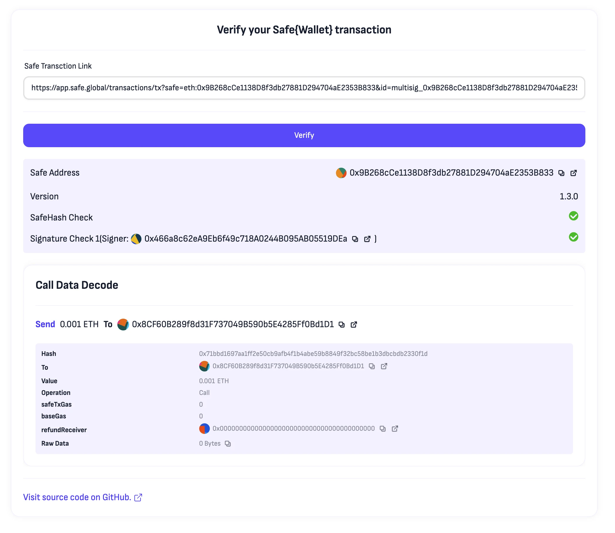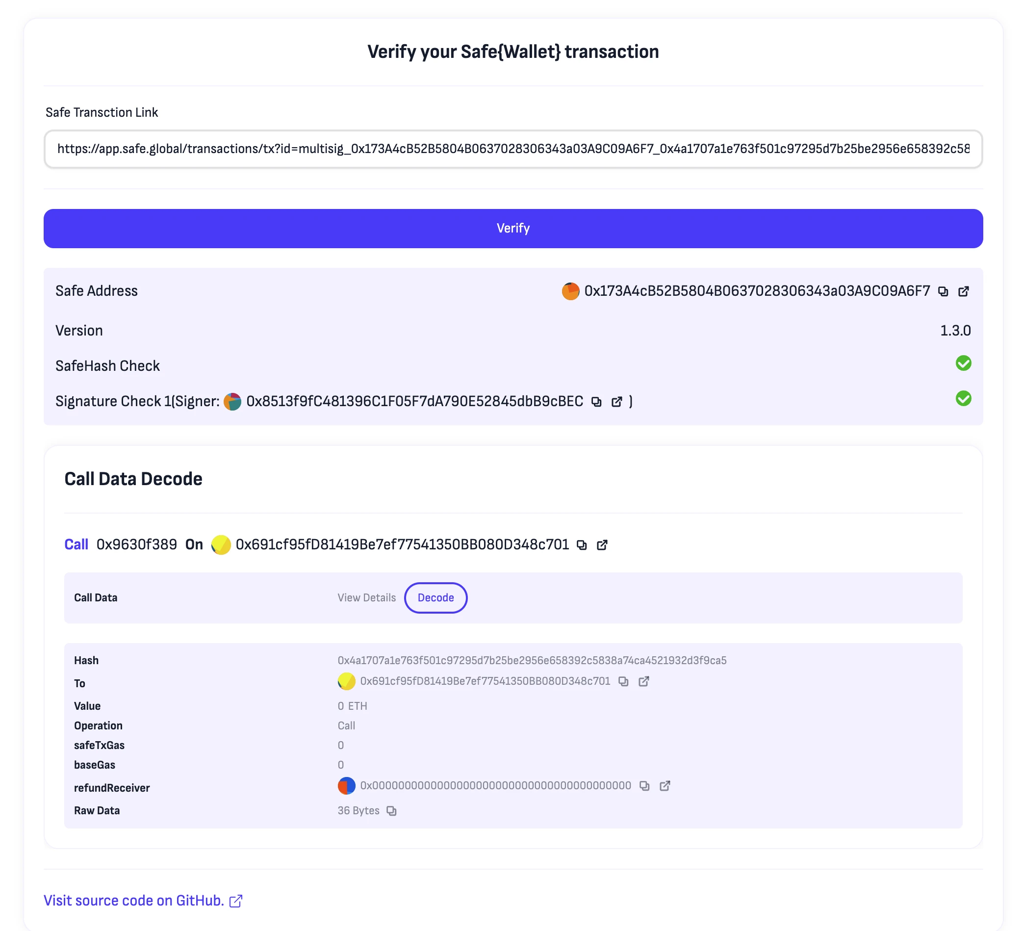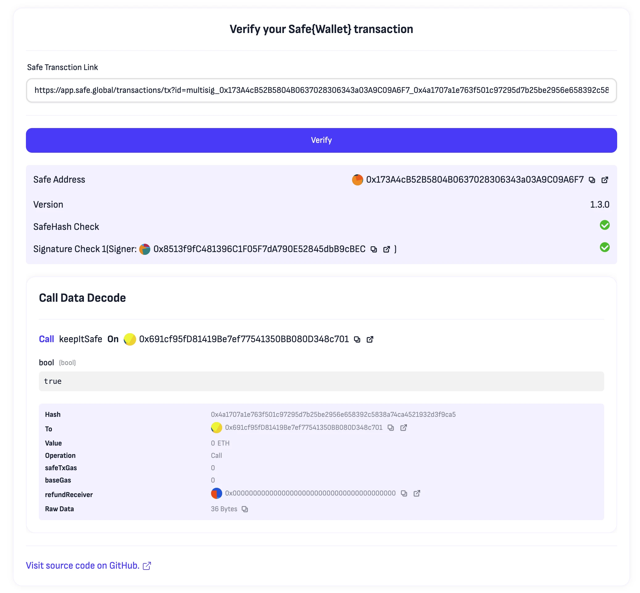 我们也对这个工具进行的验证。如图,只需要把 safe 页面里的交易分享链接粘贴进来,就可以自动读取 Safe 后端数据,并独立验证交易原文的哈希值和签名的正确性,简而言之如果确定图中的 calldata 解析是自己想要的交易,并且「SafeHash Check」和「Signature Check」验证通过,就可以认为「这是自己想发送的交易」并且「自己已经正确签名」了。