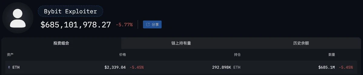 Bybit 黑客 ETH 持仓量(截止 27 日上午 9 时左右)