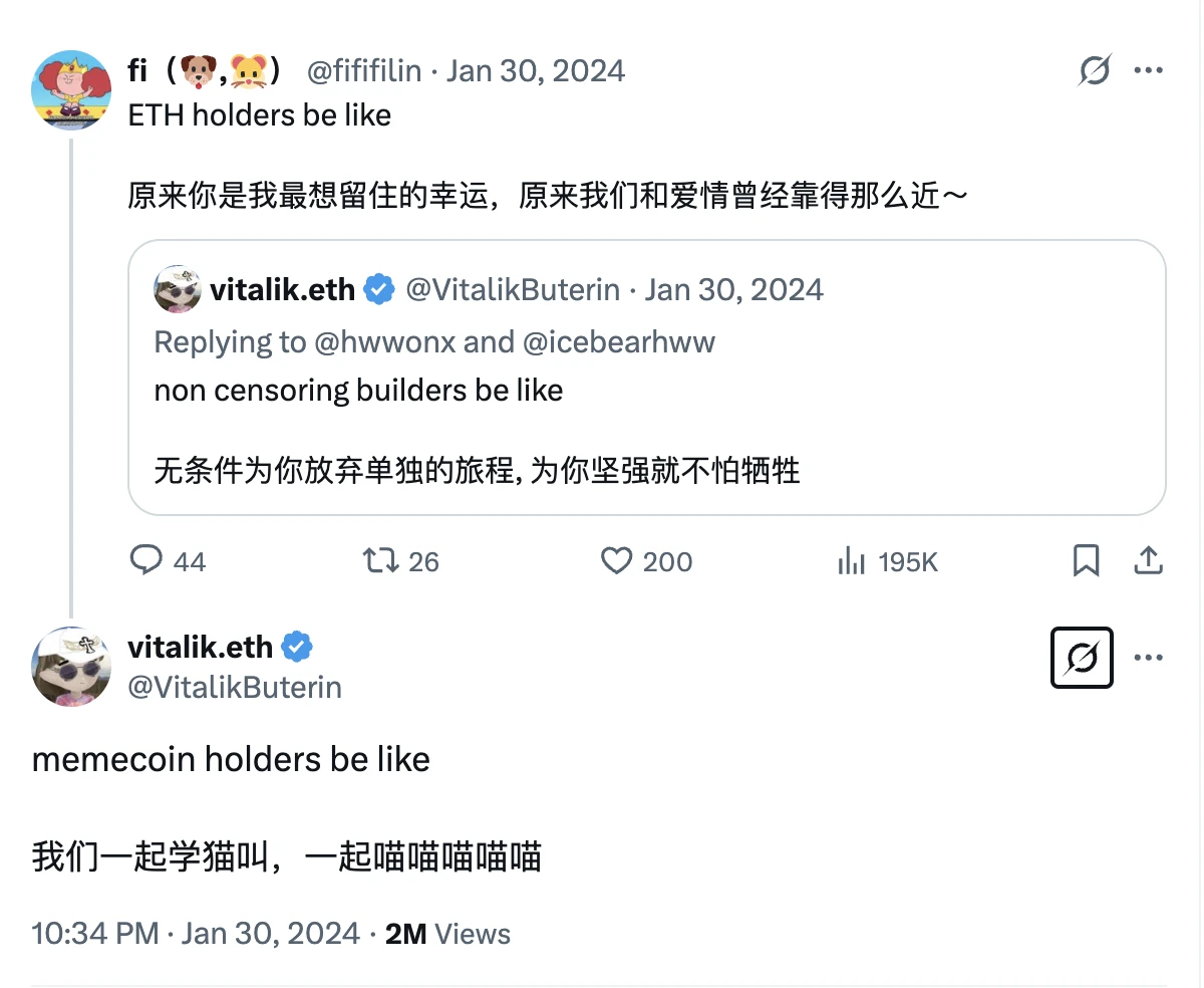 Vitalik 甚至为了玩梗发过 “我们一起学猫叫,一起喵喵喵喵喵”