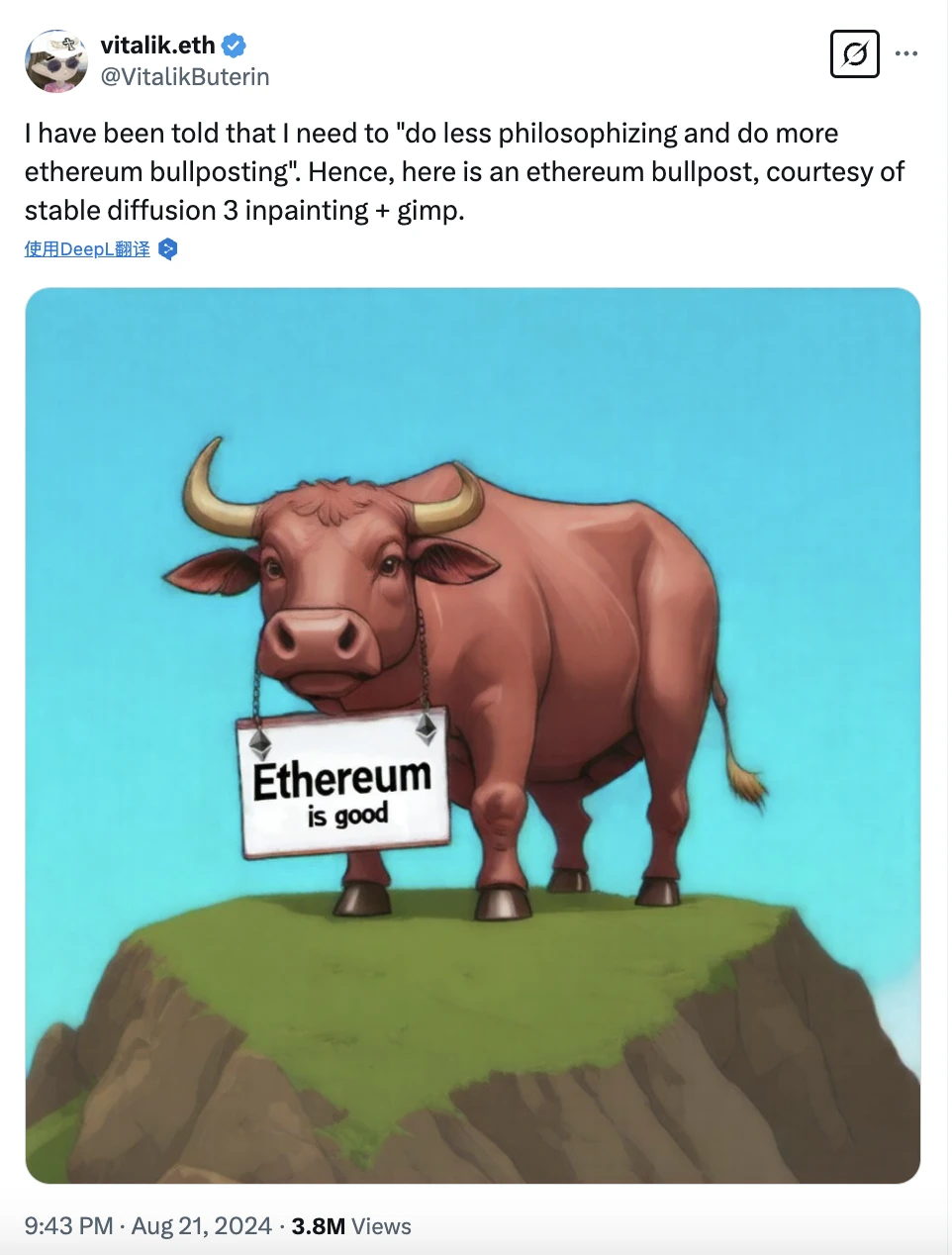 这也是去年 Vitalik 在 X 平台上几个月的发文数量甚至远超此前 1-2 年内的对外发声次数的重要原因之一:因为无法基于市场状况与 ETH 社区乃至加密圈层进行有效沟通,所以只能单方面地输出自己的观点、情绪、价值观,甚至不得不在社区的要求下 发布相关 Meme 图 。
