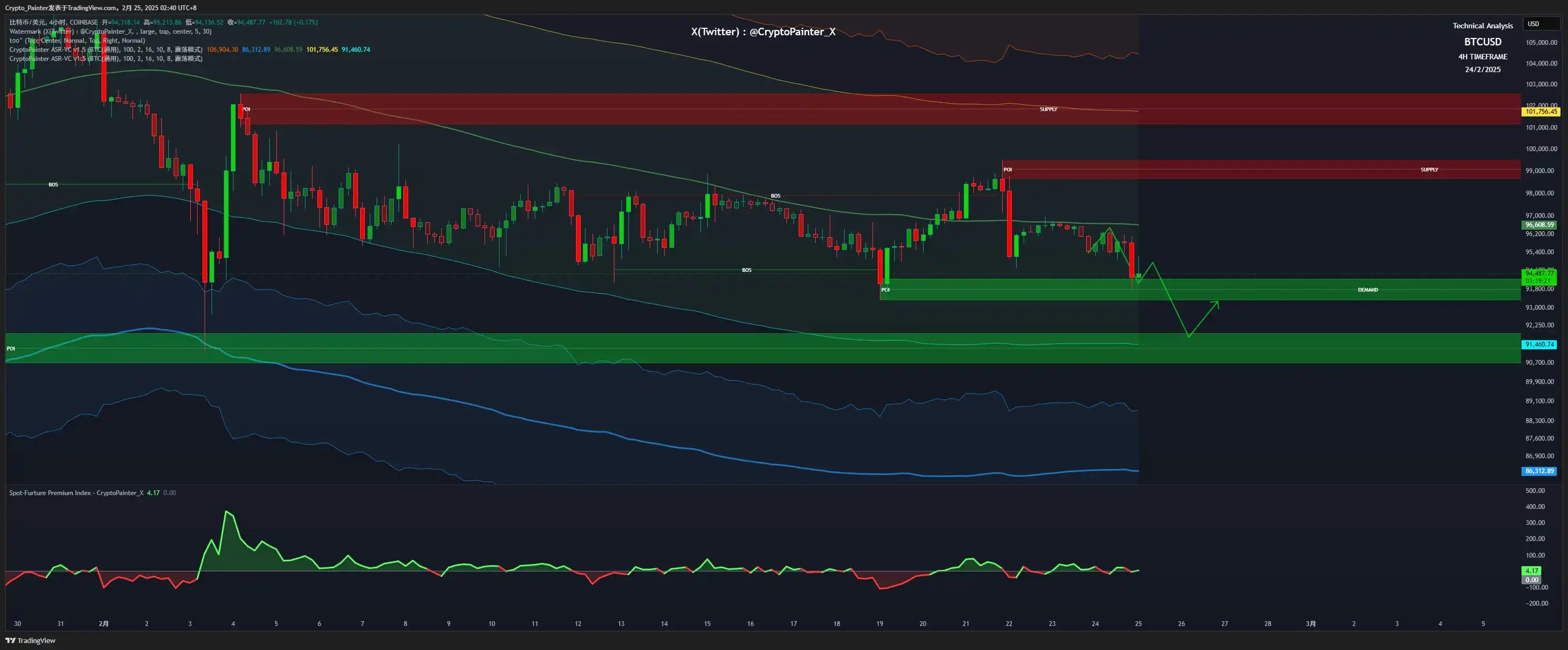 此外,当前价格已突破震荡通道的下限 91400 (青色线),且 K 线未出现长针,短期反弹力度将决定接下来的走势。青色线与核心需求区重合,理论上提供了短期支撑。然而,由于通道即将下行并可能拐头,长期走势仍偏向空头,这也提示市场可能面临进一步的下行压力。
