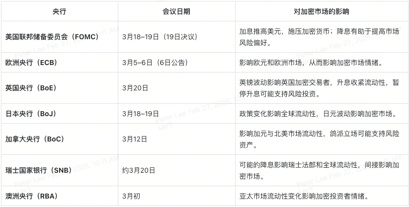 – 央行决策影响市场流动性:加息收紧流动性,给加密货币带来压力;暂停或降息可能推动投机资金流入。美联储(Fed)、欧洲央行(ECB)和英国央行(BoE)的政策将成为市场的关键推动因素。