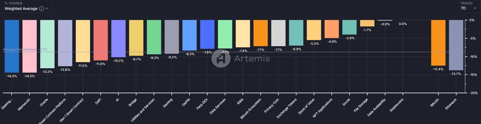 本周比特币和以太坊的涨幅分别为 -12.4% 和 -13.7% 。其中表现最差的领域为 Staking(-14.3%)、Memecoin(-13.2%)和 Oracle(-12.6%)。