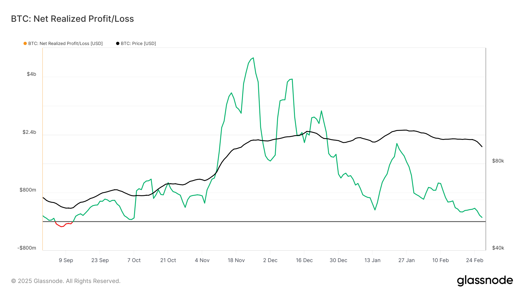 比特币已实现净损益 指标 ,市场情绪持续震盪。近期比特币价格在 8 万美元附近盘整,已实现损益较去年 12 月的高点大幅回落,并逐步接近零轴,市场中获利了结的情况有所增加。