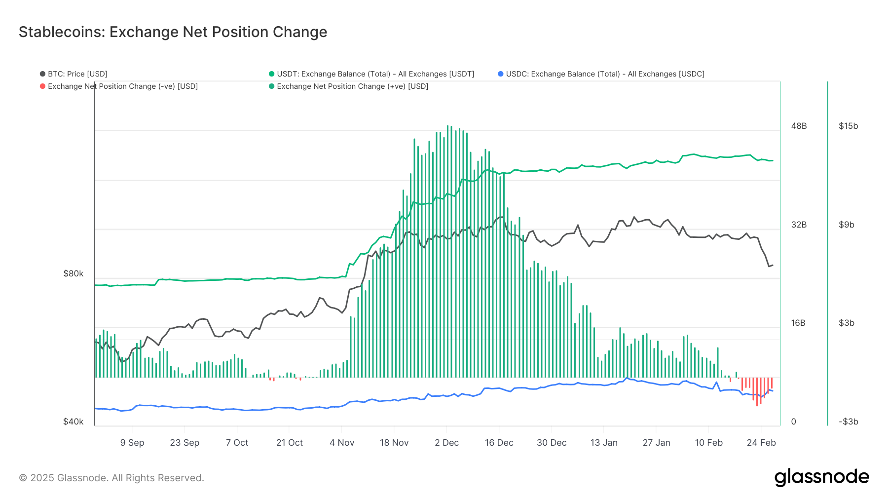 相比去年 12 月的单日最高净流入 154 亿美元,本周单日最高净流入仅为约 -7.1 亿美元,市场活跃度显著下降。特别是在 2 月 23 日,交易所的净流入为负值,达到 -18 亿美元,短期内市场缺乏强劲的资金推动力,资金流向进一步放缓。