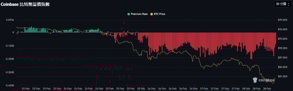 本周 Coinbase 比特币 溢价指数 在 2 月 23 日至 25 日期间之后出现明显下降,溢价指数转为负值,美国市场在该时段内存在一定的抛压。