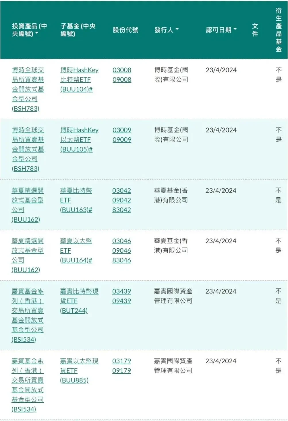 香港证监会官网正式公示虚拟资产现货 ETF 获批名单,华夏(香港)、嘉实国际、博时国际旗下相关产品在列。这也是亚洲市场上首次推出此类产品,以太币现货 ETF 产品更将是全球首批。