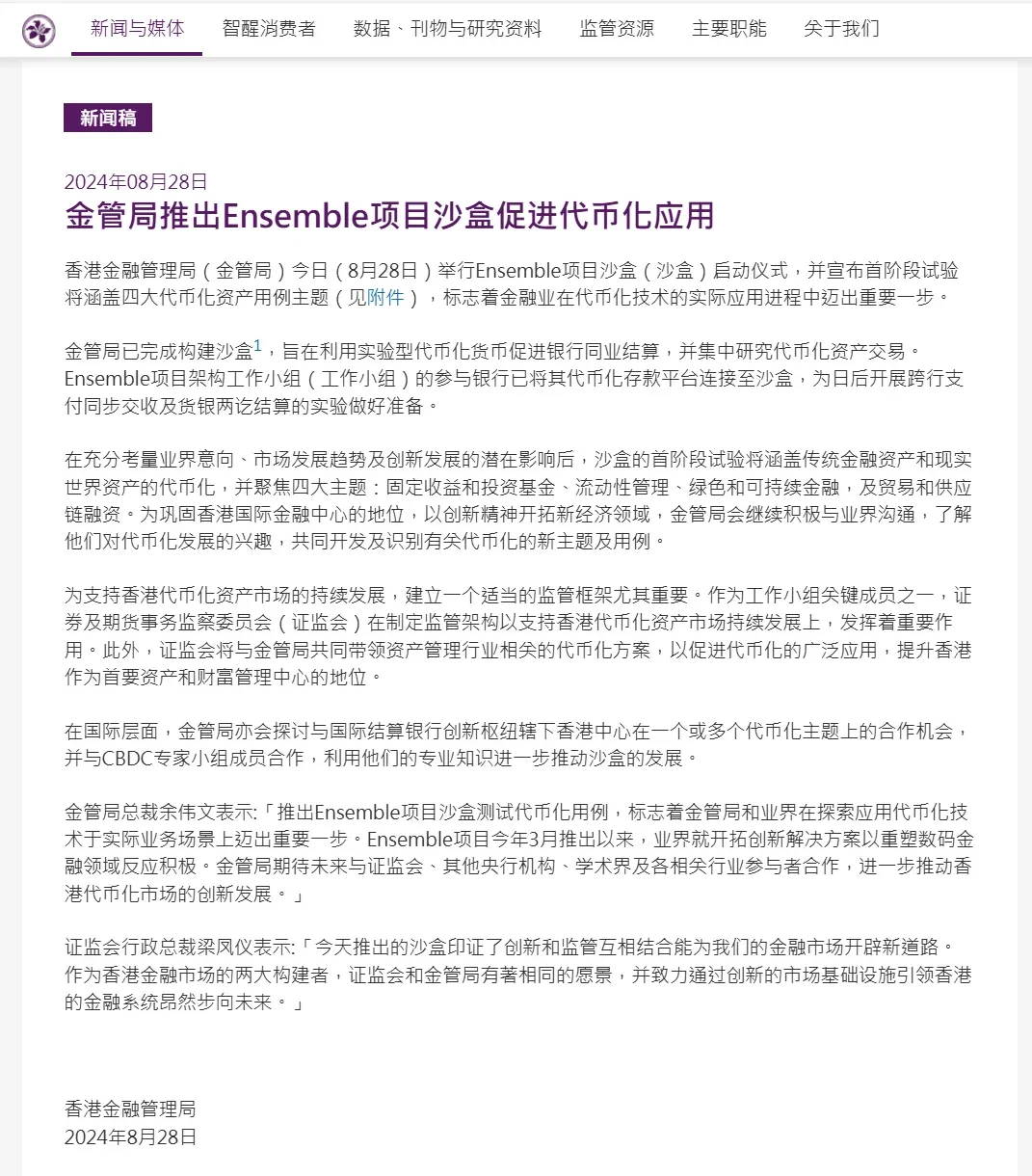 2024 年 8 月 28 日,香港金融管理局(金管局)推出 Ensemble 项目沙盒,促进代币化技术在金融领域应用。首阶段试验涵盖四大主题:固定收益与投资基金、流动性管理、绿色金融和贸易供应链融资。