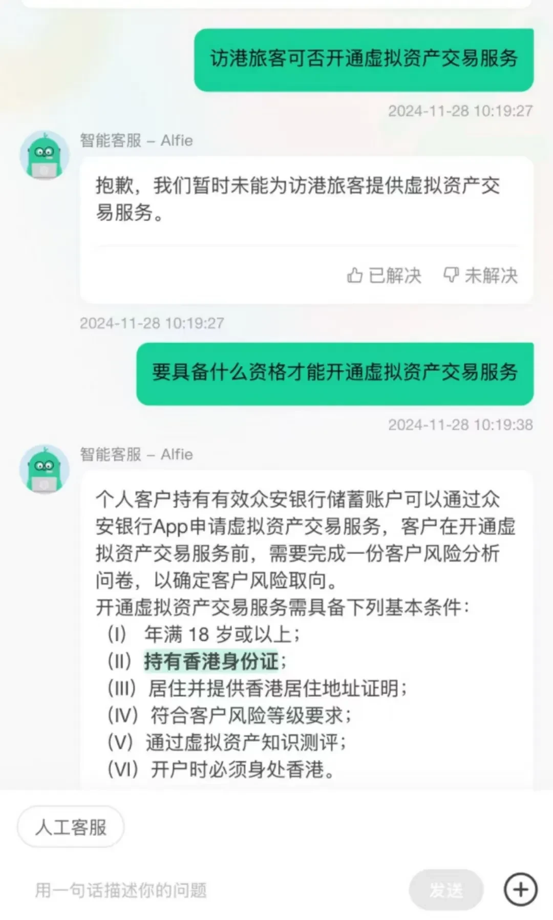 11 月 25 日,香港数字银行 ZA Bank 宣布成为亚洲首家为零售用户提供加密货币交易服务的银行,支持比特币和以太币交易,用户可通过 ZA Bank App 使用港元和美元进行交易,最低交易金额为 70 美元或 600 港币,新用户前三个月免佣金。该服务仅限香港身份证持有者。
