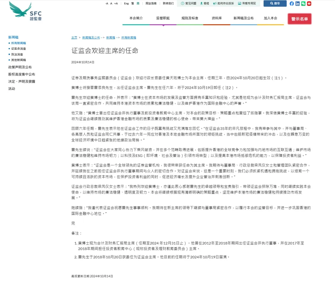 香港特区行政长官根据《证券及期货条例》委任黄天佑博士为香港证监会主席,任期三年,自 2024 年 10 月 20 日至 2027 年 10 月 19 日。
