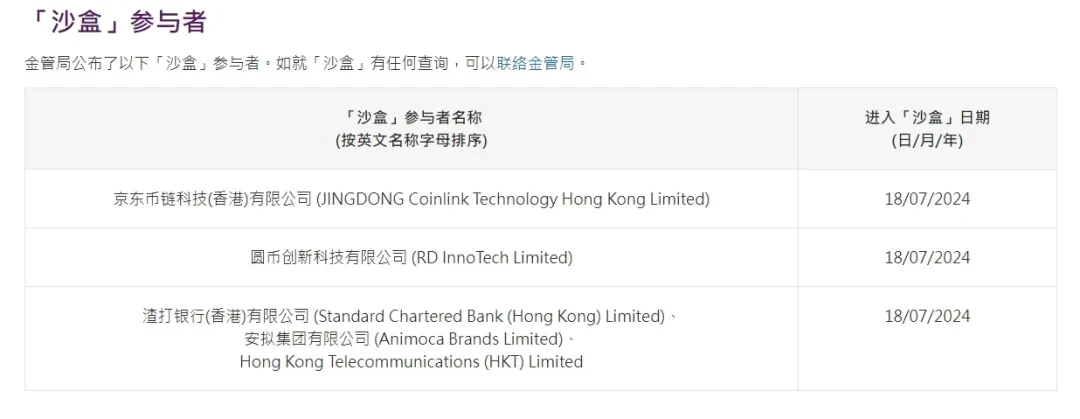 2024 年 7 月 18 日,香港金融管理局(HKMA)发布了稳定币监管沙盒参与名单,京东、圆币、渣打成为首批参与企业。