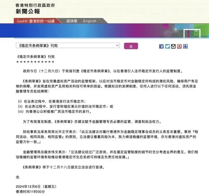 《稳定币条例草案》于 12 月 18 日提交立法会进行首读,该条例草案规定,发行法币稳定币、港元稳定币或向公众推广稳定币的活动需获得牌照。监管重点包括储备资产的稳健管理、持币人的赎回权保障以及打击洗钱等要求。