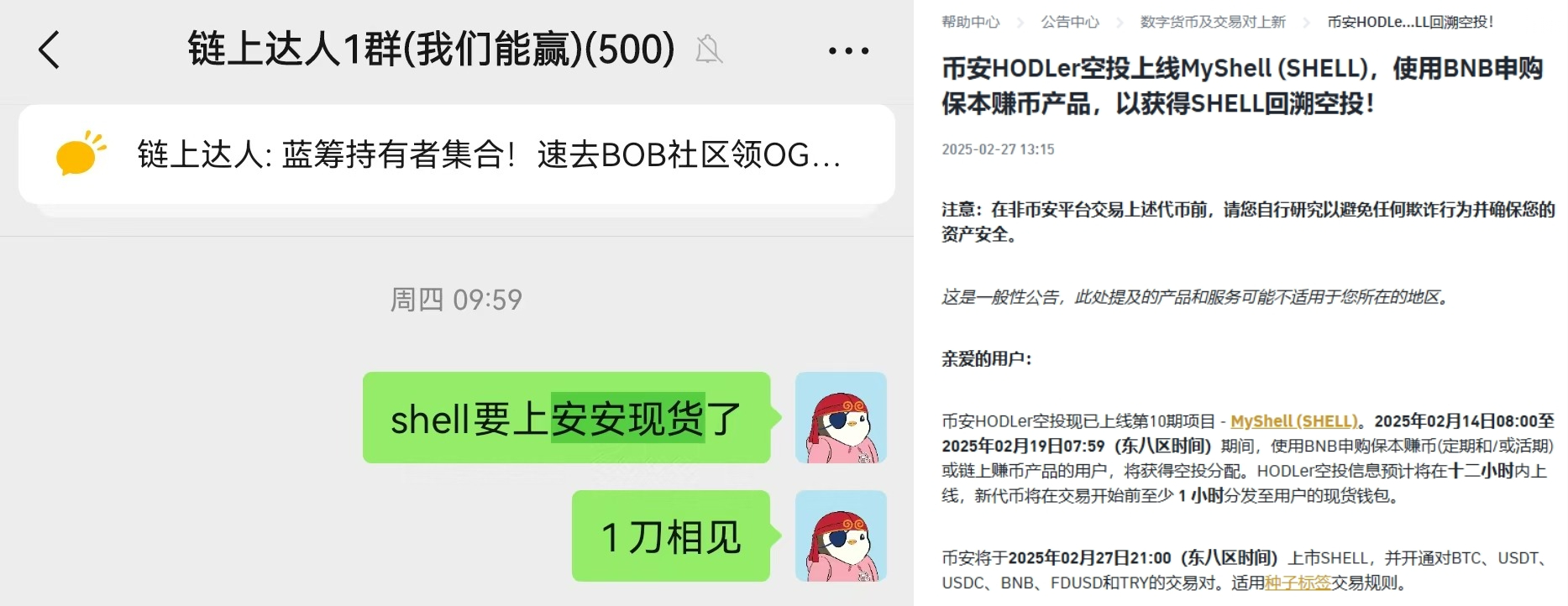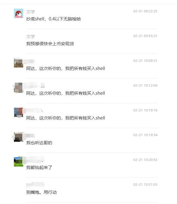 几天之后,戏剧性的一幕发生了。2 月 27 日上午 10 点,我在群里随手发了句:“Shell 要上安安现货了, 1 刀相见”。