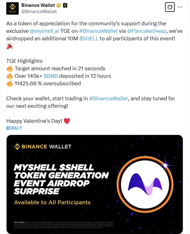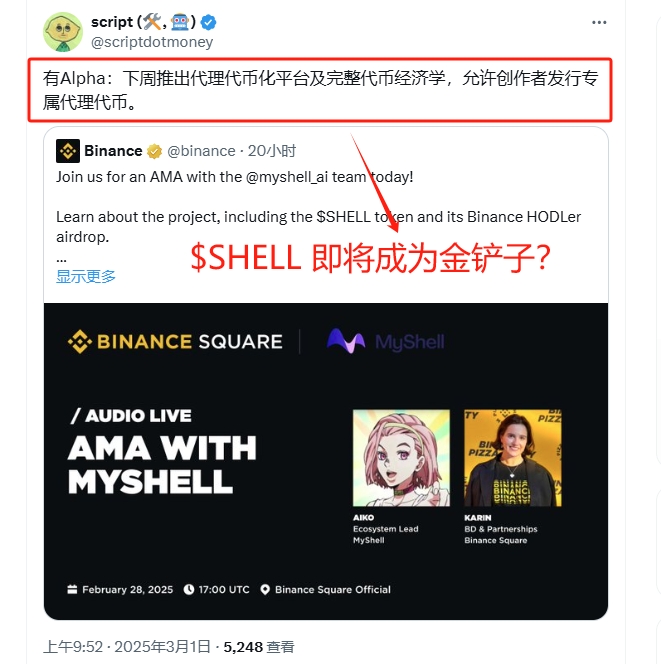 你以为剧情就这样结束了?显然没有。就在昨天,Shell 官方联合币安钱包开 AMA,虽然没有围观,但参考 @scriptdotmoney 推文, Shell 将在下周推出代理代币化平台及完整代币经济学,允许创作者发行专属代理代币。