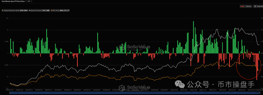 除了内部风险集中爆发外,宏观风险的冲击也是加密市场持续下跌的重要原因之一。在特朗普削减财政支出和挥舞关税大棒的背景下,美股持续动荡,科技七巨头过去一周的跌幅中位数达到13%。这使得加密市场难以再享受到美股的流动性溢出。因此,在美股暴跌的同时,比特币ETF也遭遇了创纪录的流出。如果没有政策性(国储比特币)利好或者技术突破(基本面改善)作为对冲,加密市场仍会继续在美股的下跌中承压。