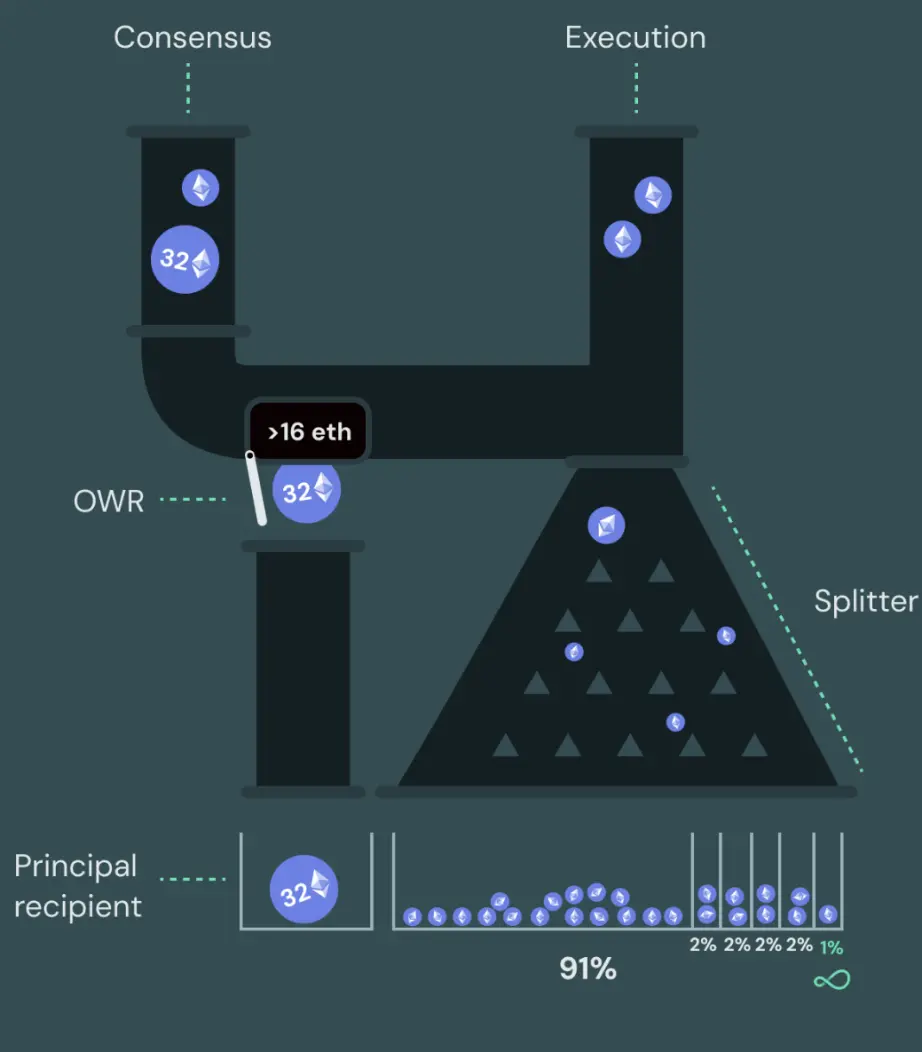 验证器有两条收入流,分别是共识层奖励和执行层奖励。提现接收者关注的是前者,持续地接收来自持有超过32个以太币的验证器的余额,并在验证器退出时接收验证器的本金。