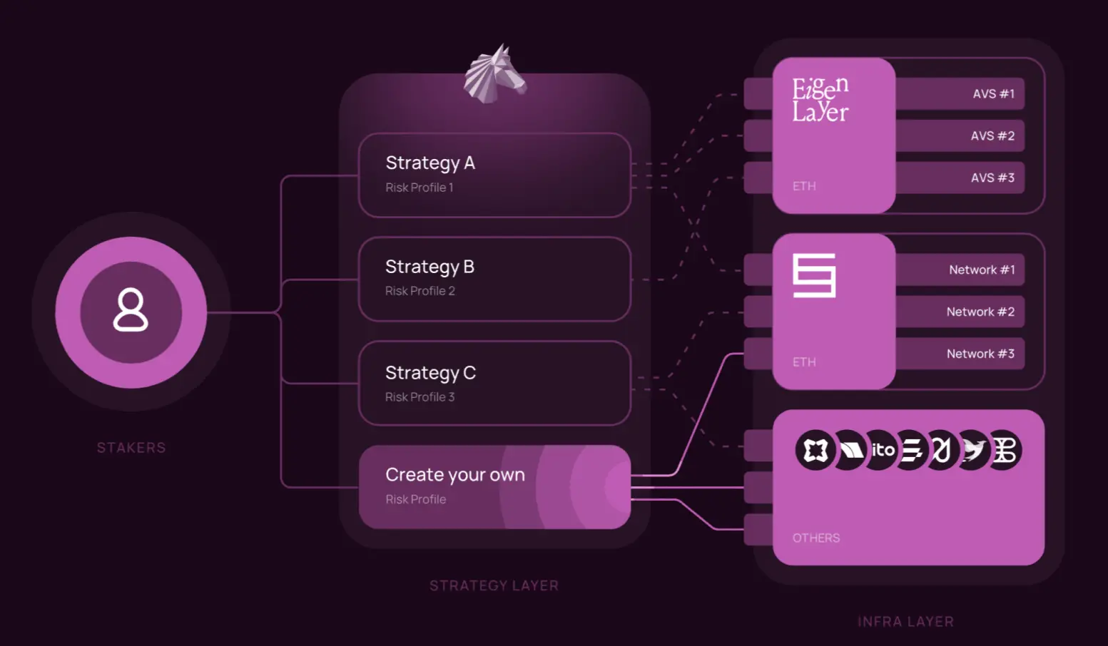 它将投资者(质押者)、风险管理者(策略管理者)和基础设施层的角色分开。用户可以根据自己的需求无权限创建策略金库,并可以选择性地将这些金库开放给其他质押者。