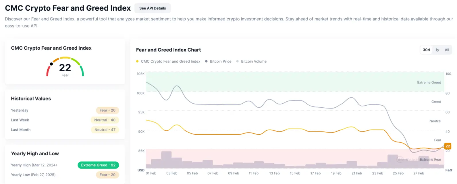 本周指数下降至 22,表明市场处于“极度恐惧”状态。这一下降反映了投资者的不安情绪,主要原因包括以下几点: