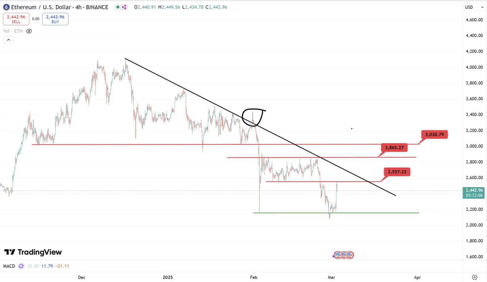 对于ETH,跌至接近2000美元后的反弹同样被2月盘整区间的底部,也就是2550美元压制,现已进入回调行情,但就目前的回调强度看,价格在2400美元上方企稳是大概率事件,但上方阻力区间众多,尤其是黑色标注的大周期下行趋势线,该趋势线尽管在1月末时一度失效,但在2月25日的行情中再次验证了该趋势线的有效性,因此可以一定程度上认定1月末的突破为假突破。