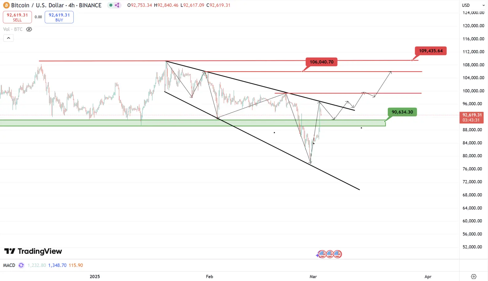 上周BTC在整个交易日周期走出下跌超18%的不利态势,但尽管基本面的不利因素始终压制着币价,但利空几乎全部由特朗普在周日晚的发言击碎,鉴于本周将有几项重大经济指标发布,因此反弹能否继续仍难预料,但假设非农以及初请失业金人数符合预期,BTC的回调可以企稳于9万美元上方,则本周末段继续反弹并突破下降楔形形态的上沿将是可以期待的,一旦突破且确定有效,那么短期的下降趋势可以说是被逆转了,后续的反弹点位可继续关注图中三个重点阻力区间。