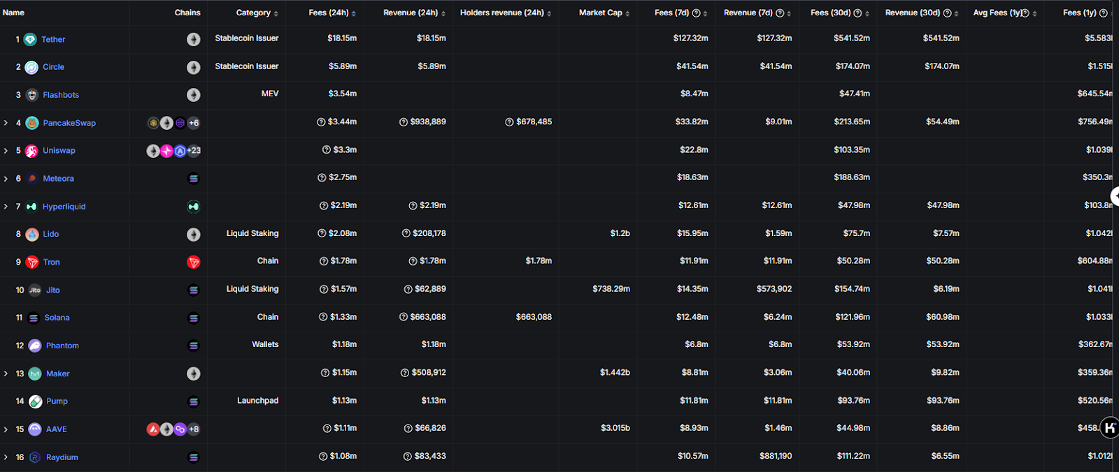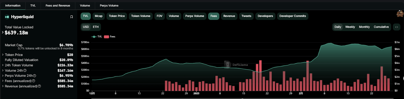 截至 2025 年 2 月 28 日,Hyperliquid(HYPE)以 24 小时协议收入 219 万美元排名协议第七、7 天累计 1261 万美元的表现,不仅超越 Pumpfun 等新兴协议,更在去中心化永续合约赛道建立起绝对统治地位。