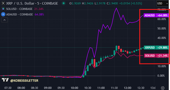 自公告宣布以来,这些代币均出现大幅上涨,其中,ADA涨幅高达64%,XRP上涨30%,SOL也上涨21%。