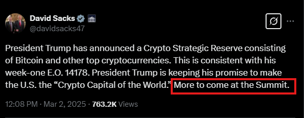 几天前,特朗普的儿子Eric Trump也发布了" ₿uy the dips "(逢低买入)的帖子。与此同时,特朗普的加密顾问David Sacks昨日也在社交媒体上表示,“更多消息将在即将召开的加密峰会上公布”。据悉, 特朗普将于3月7日在白宫主持首届加密货币峰会,外界普遍猜测届时可能会有更多数字货币被纳入储备名单。