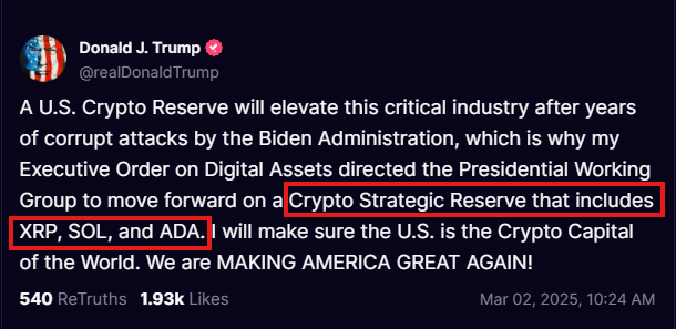 除了宣布成立“加密战略储备”之外,特朗普承诺将“确保美国成为全球加密货币中心”。这一消息迅速引发市场狂热,特别是在声明中提到的部分数字货币,如Ripple($XRP)、Solana($SOL)和Cardano($ADA)。