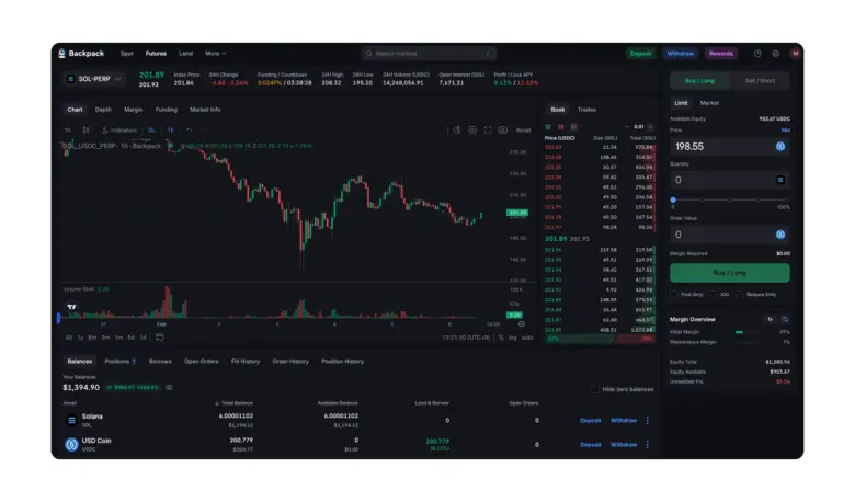 目前Backpack上有57个现货交易对,15个永续合约和5种抵押借贷流动性池。据Coinmarketcap数据,目前Backpack总资产金额为3412万美元,其中约54%为USDC,26.22%为SOL。截至发稿,交易量为6194018美元。