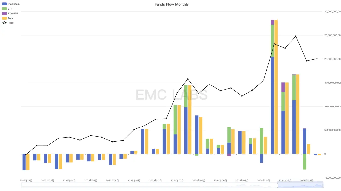 进入分类资金内部,EMC Labs发现稳定币资金与BTC Spot ETF通道资金呈现分歧态度。稳定币通道全月流入53亿美元,而ETF通道资金流出高达32.49亿美元。