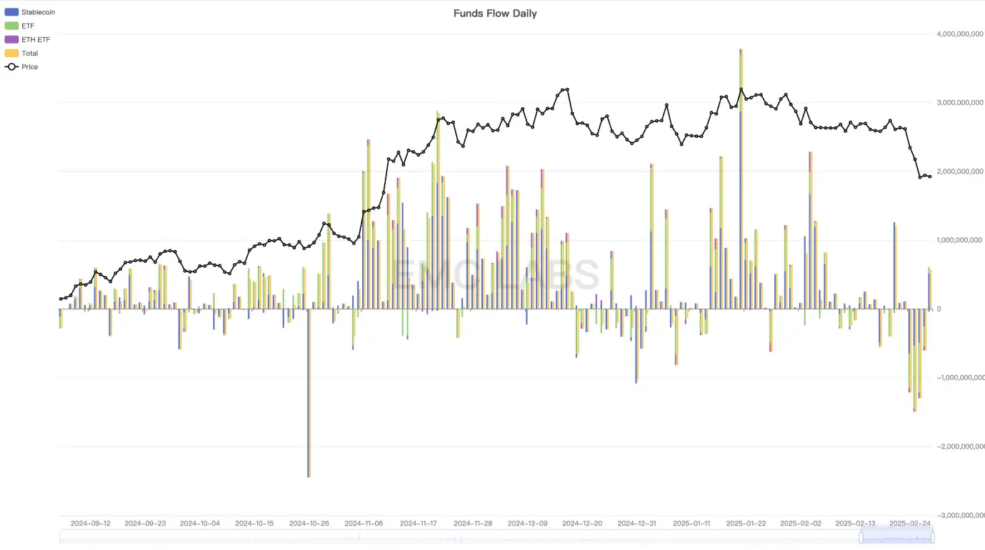 伴随特朗普交易情绪的冷却,2月加密市场的资金流入大幅放缓。这种流入放缓与价格下跌不断交互影响,最终导致了BTC价格在96000美元一线盘亘良久之后于2月最后一周破位暴跌。2月资金流入规模大幅下降至21.11亿美元。