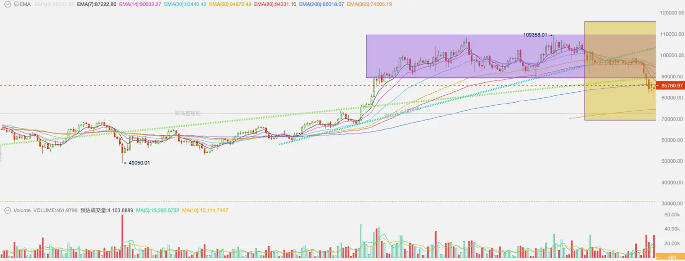 技术上,“特朗普底”(上图紫色区域)已被有效跌破,这也呼应了美股对于“特朗普交易”的回吐。EMC Labs此前所关注的本轮周期“第一上升趋势线”、“第二上升趋势线”在短时间内均被迅速击破。及至月底,BTC价格收于200日均线附近。