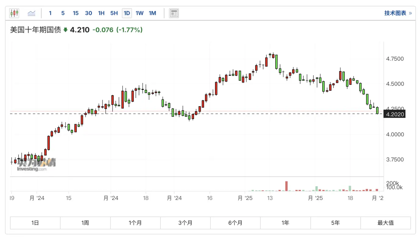 资金启动避险操作,美十年期国债收益率迅速下跌,黄金也呈现筑顶迹象。