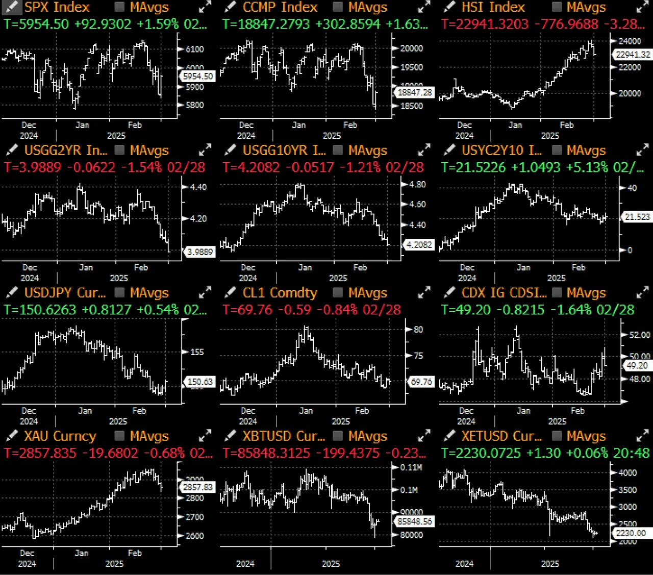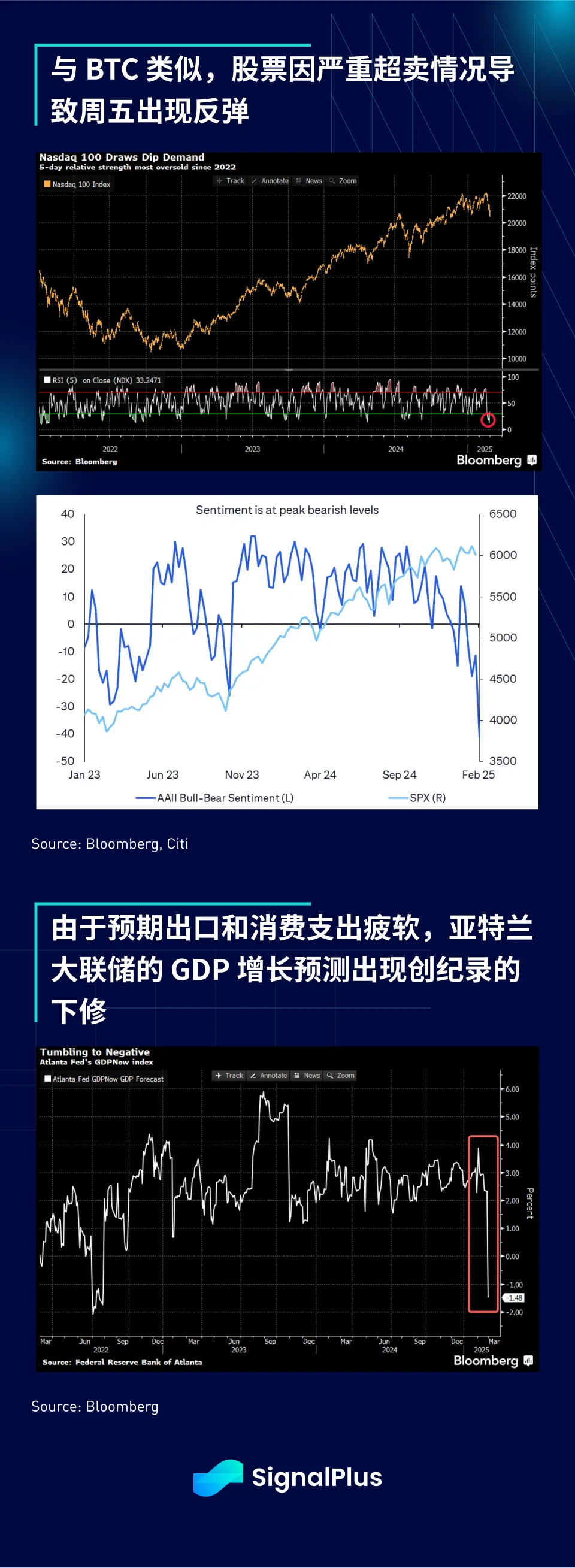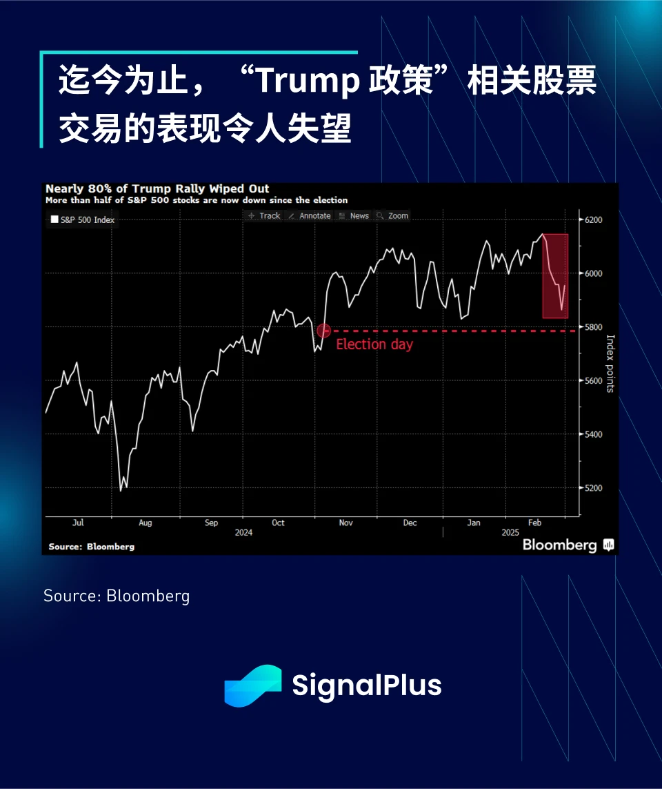回到宏观市场,尽管股市在上周五收盘出现反弹,但最受 Trump 政策影响的股票已自选举高点下跌约 80% ,且他在关税和 DOGE 支出削减方面的不确定态度也开始对市场情绪产生负面影响。